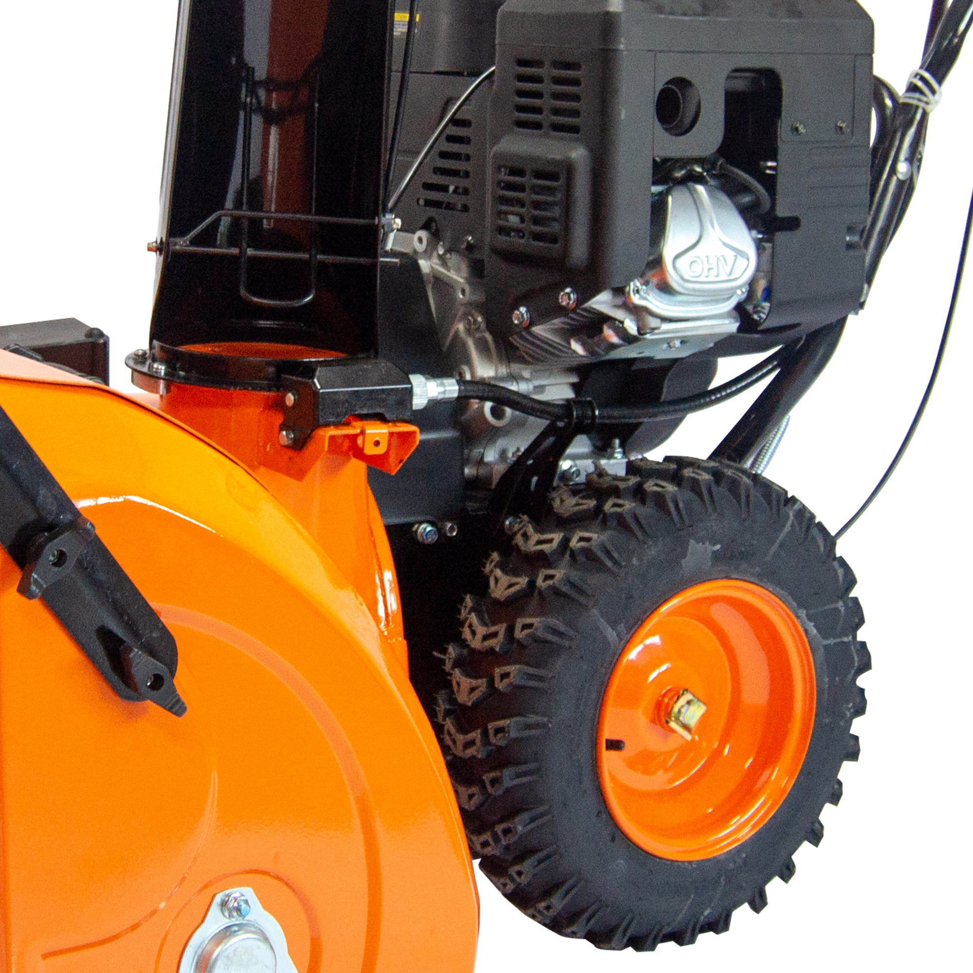 Diametrul roții de 40 cm face ca orice obstacol să poată fi escaladat cu ușurință și în condiții de siguranță pentru utilizator. Garda înaltă la sol oferită de roți protejează șasiul și motorul de obiecte dure sau pietre care pot intra în contact cu freza. Pornirea motorului este făcută automat, la cheie.